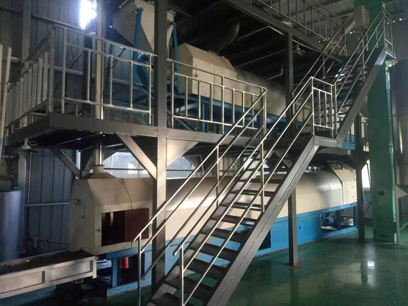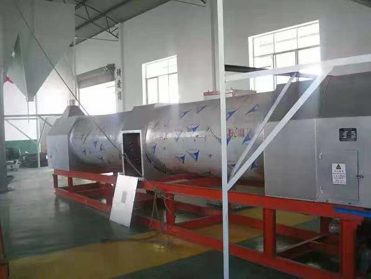 我們解決其技術問題所采用的技術方案是:一種新型環(huán)保節(jié)能熱風炒爐,由電源供電,包括第一燃燒室、第二燃燒室、熱風炒爐滾筒、存料機、自動喂料器、出料機、引風機和排潮風機,所述熱風炒爐滾筒的入口端通過自動喂料器與所述存料斗連通,所述熱風炒爐滾筒的入口端還通過風道與所述排潮風機連通,所述熱風炒爐滾筒的出口端與出料機連通,所述第一燃燒室和第二燃燒室通過風道與引風機連通,所述第一燃燒室和第二燃燒室分別位于所述熱風炒爐滾筒的下方,所述熱風炒爐滾筒軸心線與水平面形成2°到8°的夾角,所述第一燃燒器和第二燃燒器安裝位置在相應燃燒室的前端或者相應燃燒室的兩個側(cè)面。我們設備取消了原熱風炒爐所配套的單獨熱風爐、彎段風道或直段風道;在炒爐滾筒下方設計安裝兩份熱風燃燒室,用燃燒器產(chǎn)生的熱風直接對滾筒進行加熱,******限度地縮減了炒爐散熱環(huán)節(jié)和面積,從而實現(xiàn)炒爐連段式加熱。與現(xiàn)有設備相比,我們公司設備充分利用了熱風釋放的熱量,減少了熱量損失,單噸油料或糧食加工消耗添人氣甚至能降低到25nm3,降低了17%,節(jié)能降耗效果非常明顯,得到了客戶的一致好評。與現(xiàn)有設備相比,同等日加工量,所配兩臺燃燒器合計功率比現(xiàn)有設備燃燒器功率下降20%-30%,熱風設定溫度有750-800℃下降到400-500℃,明顯延長了炒爐的使用壽命。第一燃燒室和第二燃燒室的功能各不相同,工作溫度也不一致,第一燃燒室和第二燃燒室能夠?qū)崿F(xiàn)分段加熱溫度控制,更加靈活與合理,安全可靠,便于操作與控制。